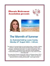A celebration of all the manifold joys of summer in a very visual, fun and informative talk by professional speaker Louise. When: Monday, 14 August 2023; 2:00pm for 2:30pm |