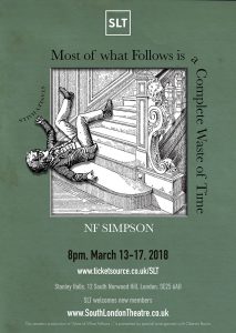 Most of What Follows is a Complete Waste of Time is a collection of peculiar and sometimes puzzling sketches, dialogues, meditations, sermons, saints’ lives and sales pitches – many never before performed – from the gently subversive genius of N. F. Simpson. Suitable for age 12+.